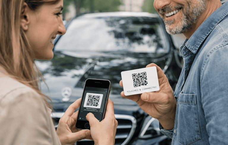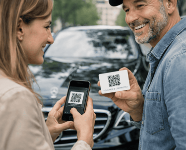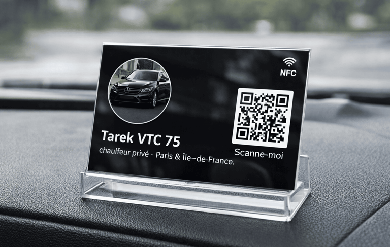 Un QR Code unique, évolutif et entièrement personnalisable, qui redirige vos clients soit vers votre page de réservation, soit vers l’enregistrement direct de votre contact. Toutes vos informations — coordonnées, véhicule, horaires et disponibilité — peuvent être mises à jour à tout moment, sans jamais réimprimer vos cartes.
